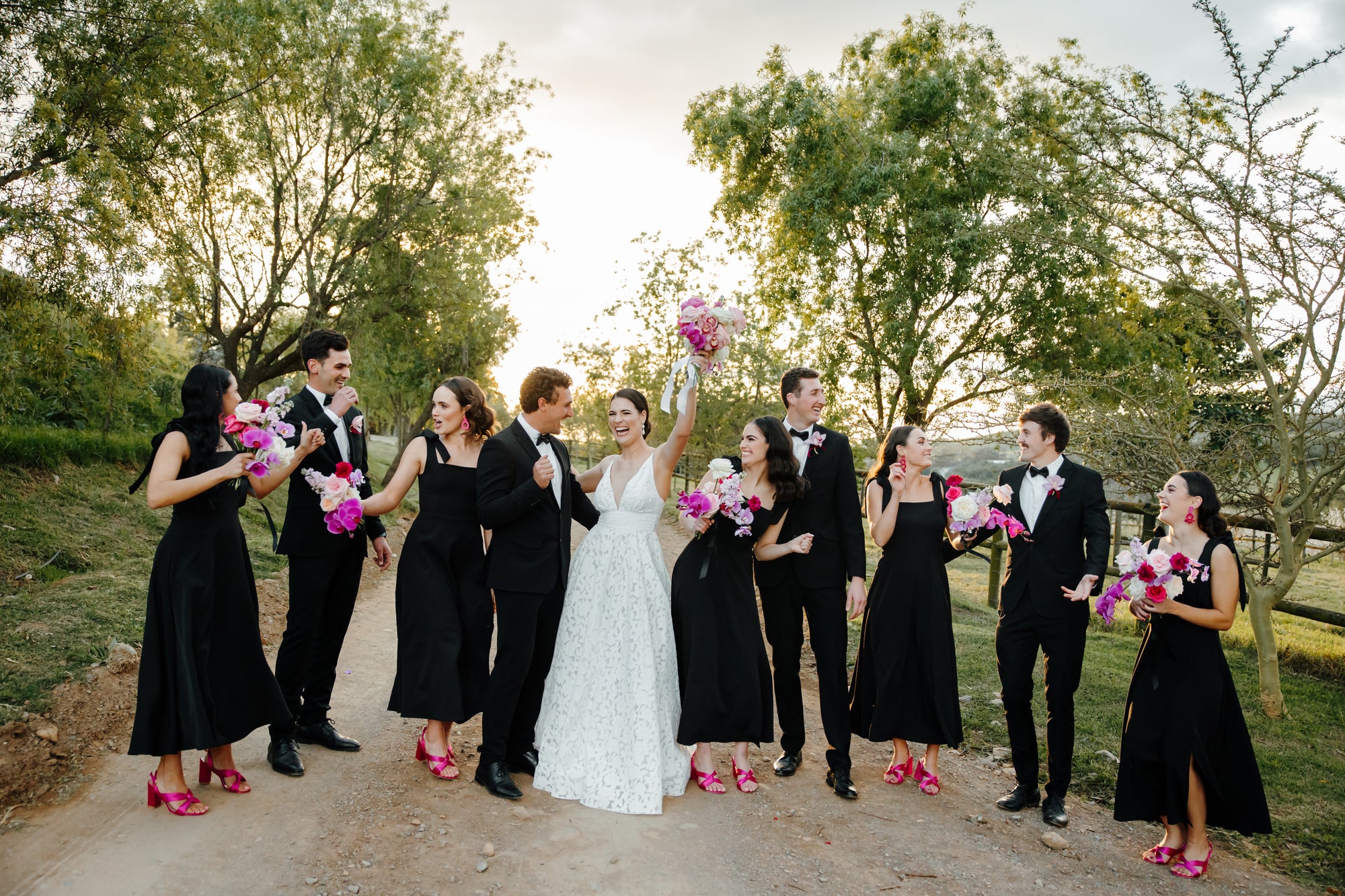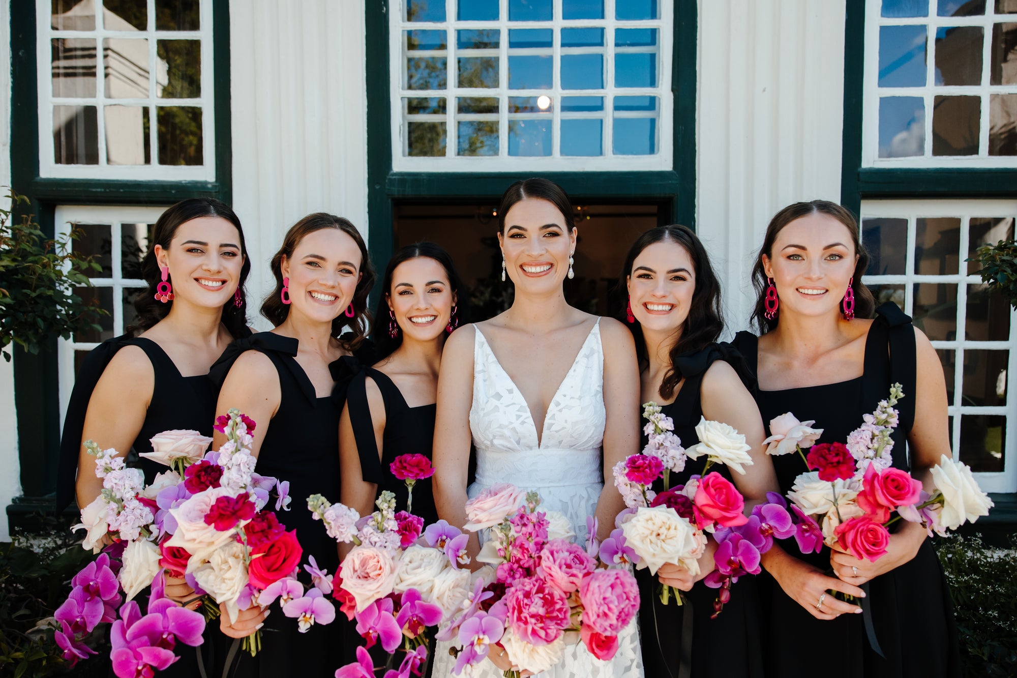 The black tone brings a bold, modern edge that translates beautifully across venues — from vineyards to grand estates. Beyond elegance, the dress photographs exceptionally well in both natural light and evening settings, ensuring unforgettable wedding albums. Its simplicity allows the bridal party’s personality and expressive bouquets to shine.