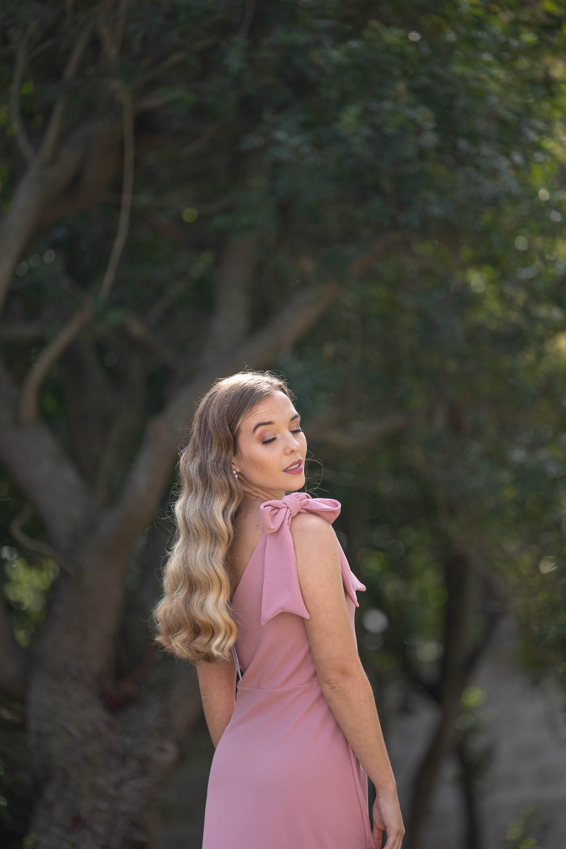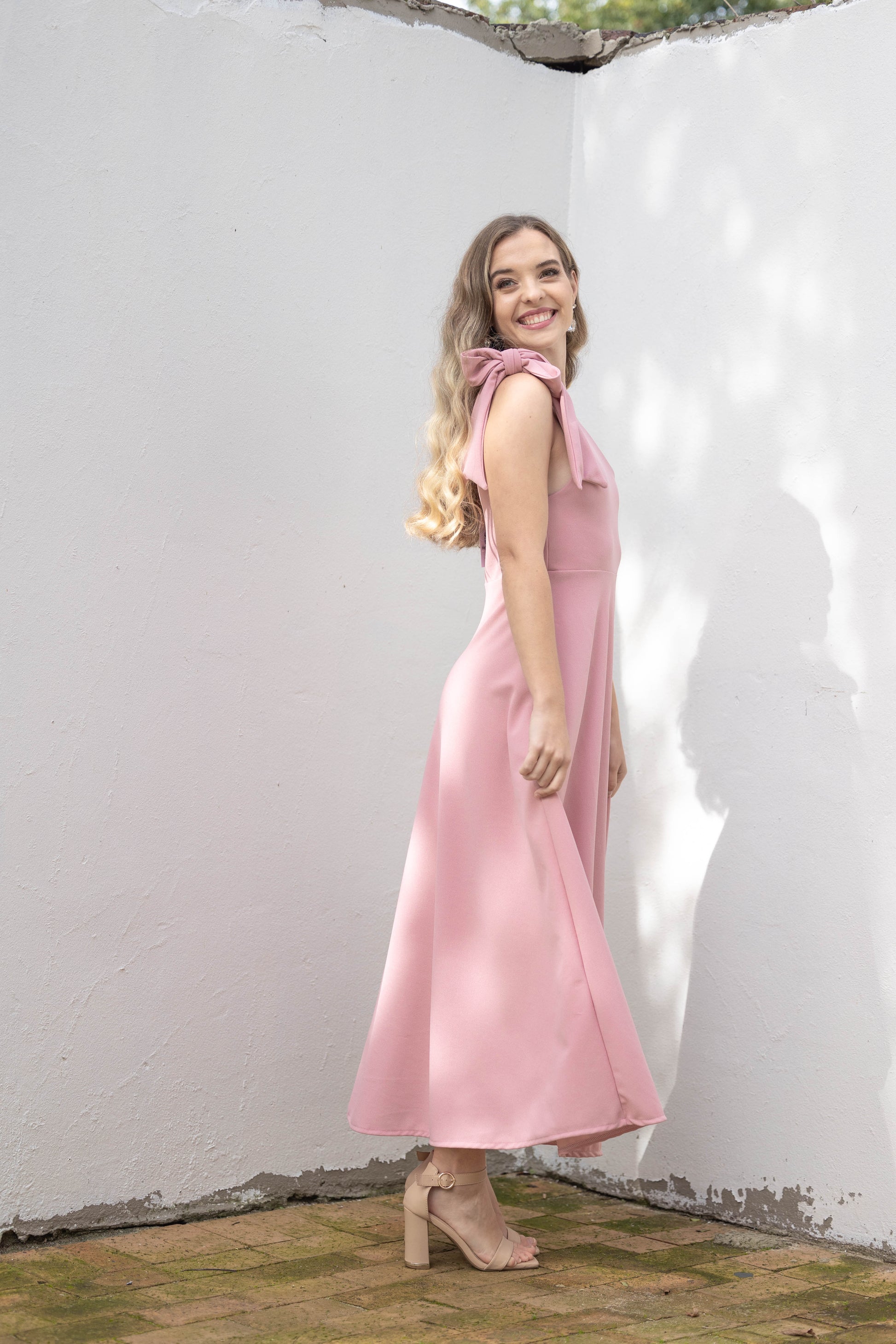Crafted in blush pink with a soft flowing silhouette, it strikes the perfect balance between playful and chic—ideal for garden parties, weddings, or evening gatherings.