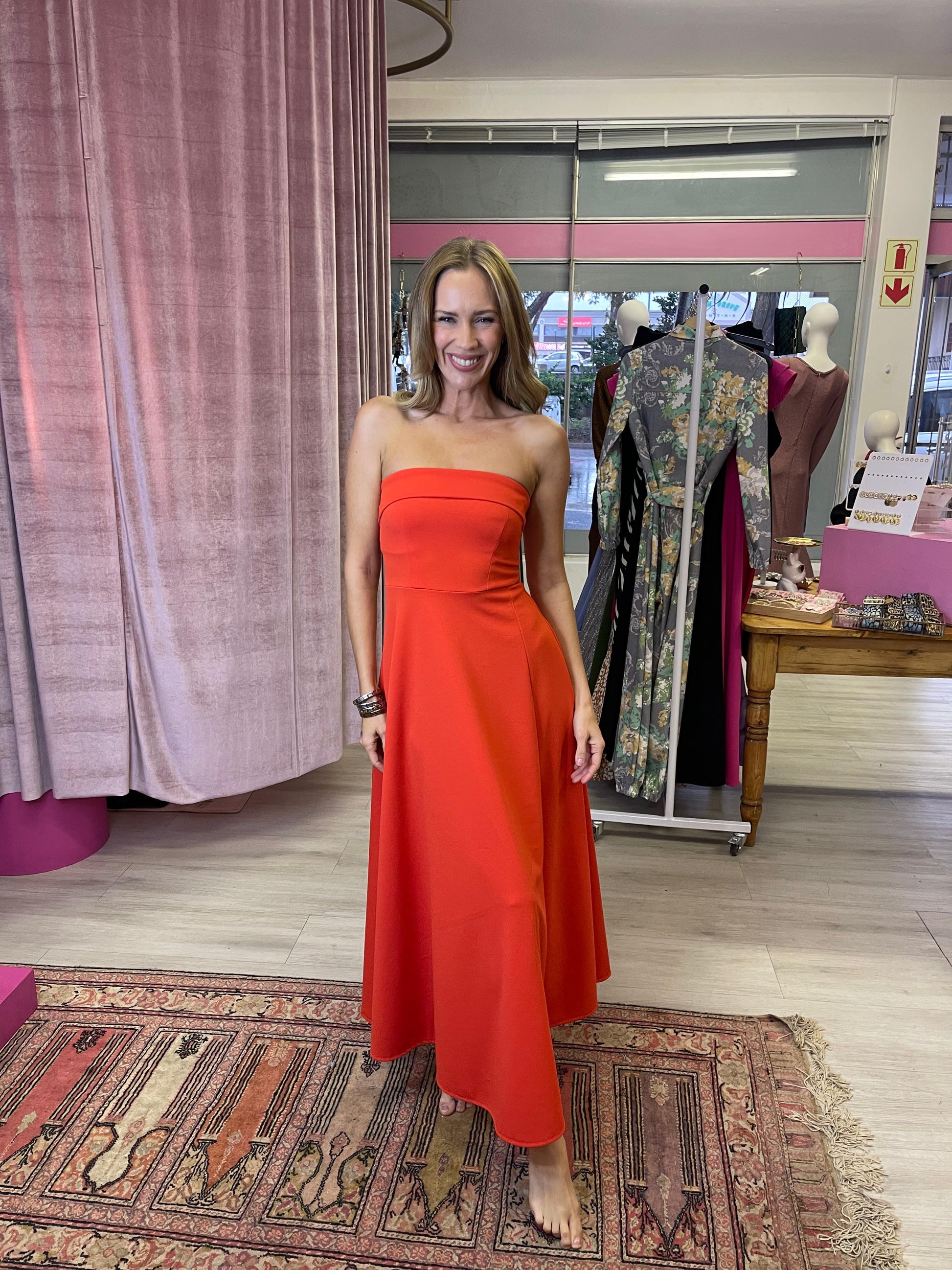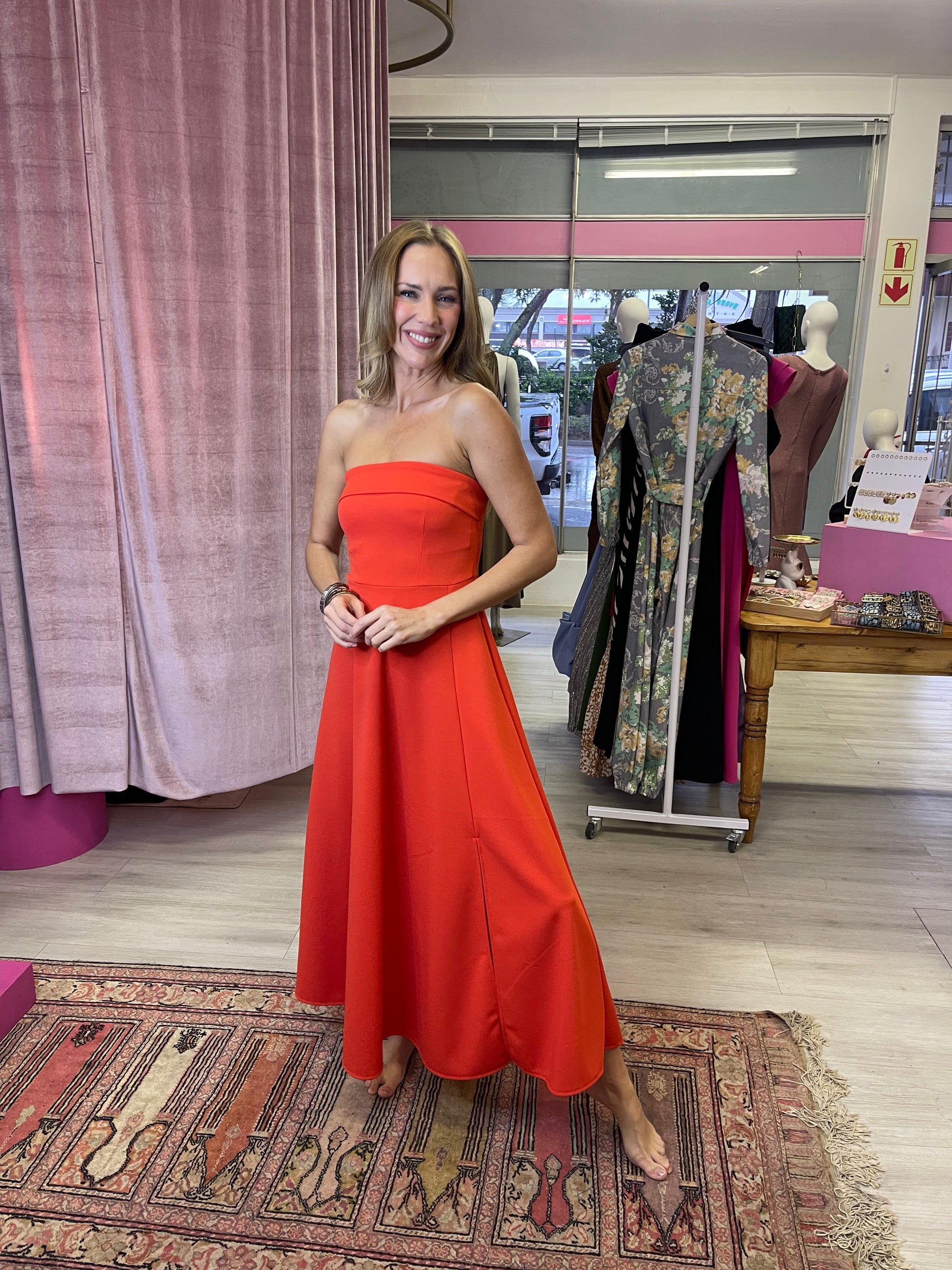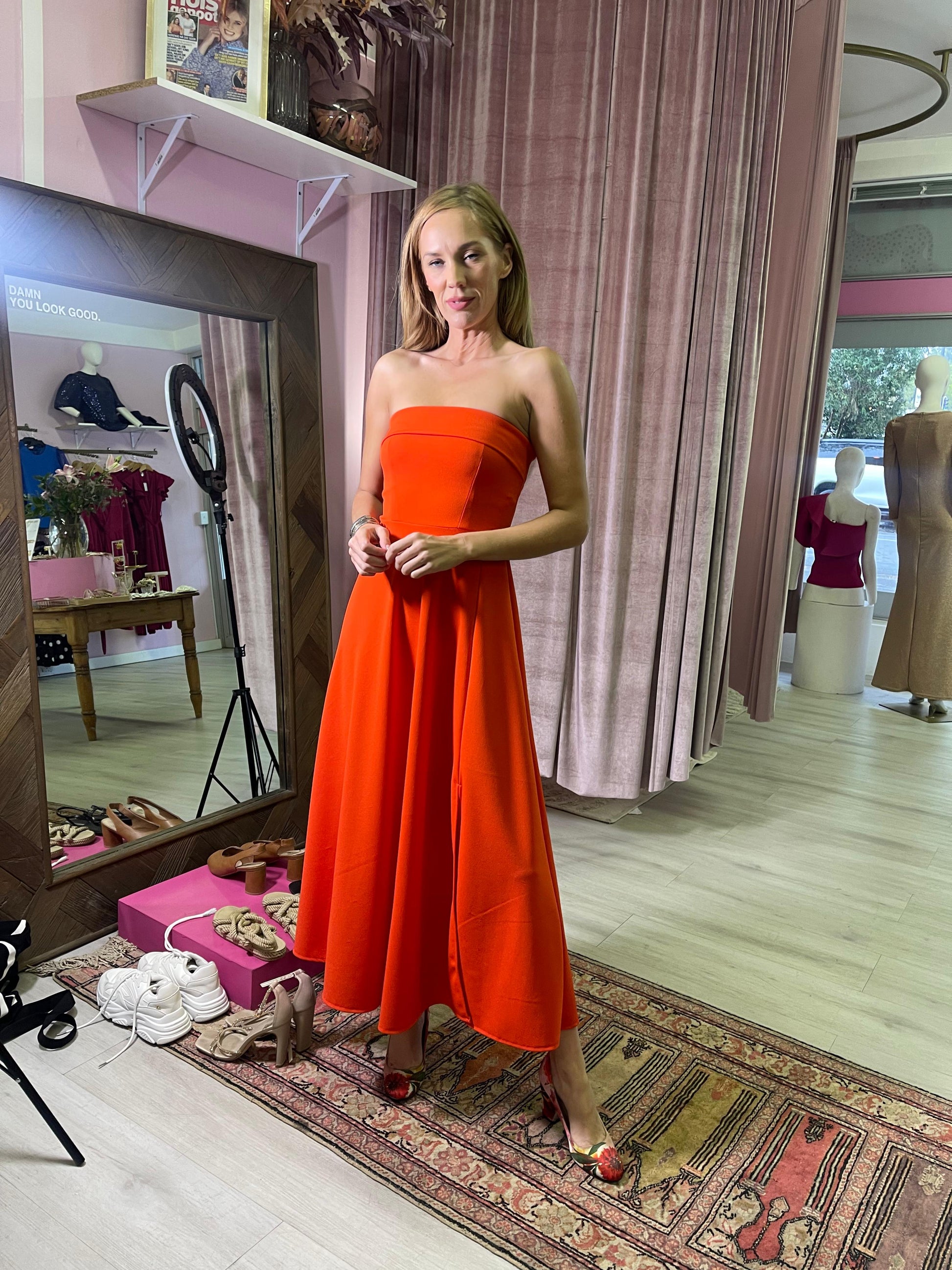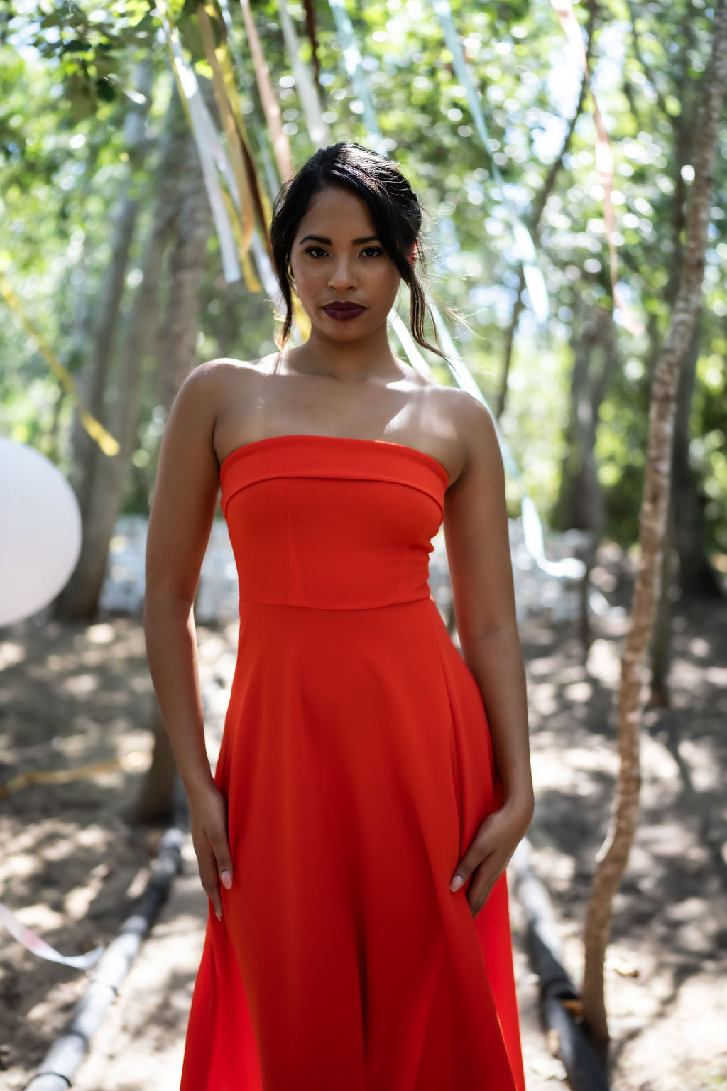 Minimalist yet striking, this design proves that less truly is more. Its bold color and strapless silhouette combine to create a look that feels both effortless and unforgettable.