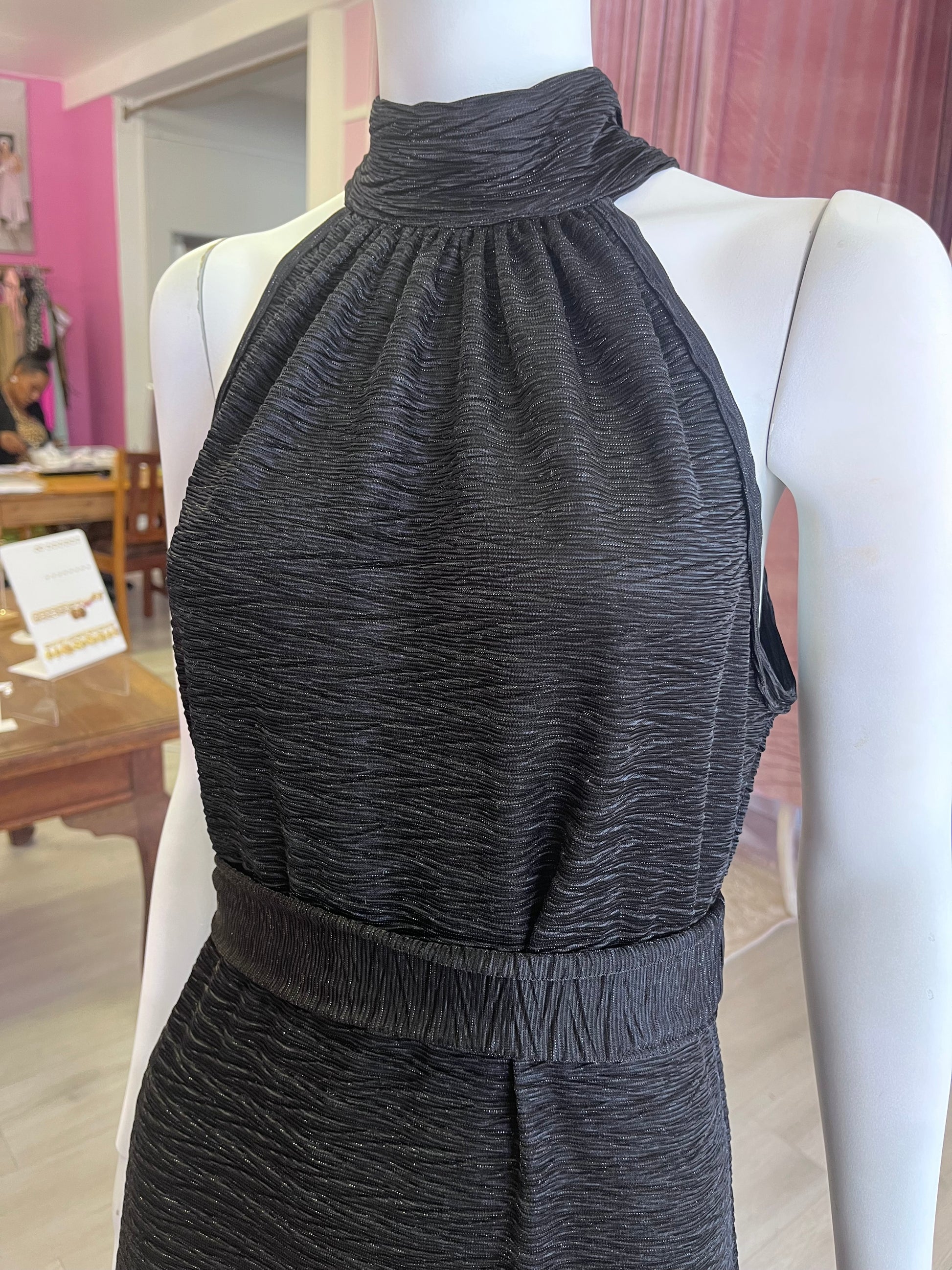 Its sleek, all-black finish makes it endlessly versatile—perfect for evenings out, formal gatherings, or as a polished daytime statement. The subtle texture of the fabric adds depth while keeping the overall style effortlessly minimal.