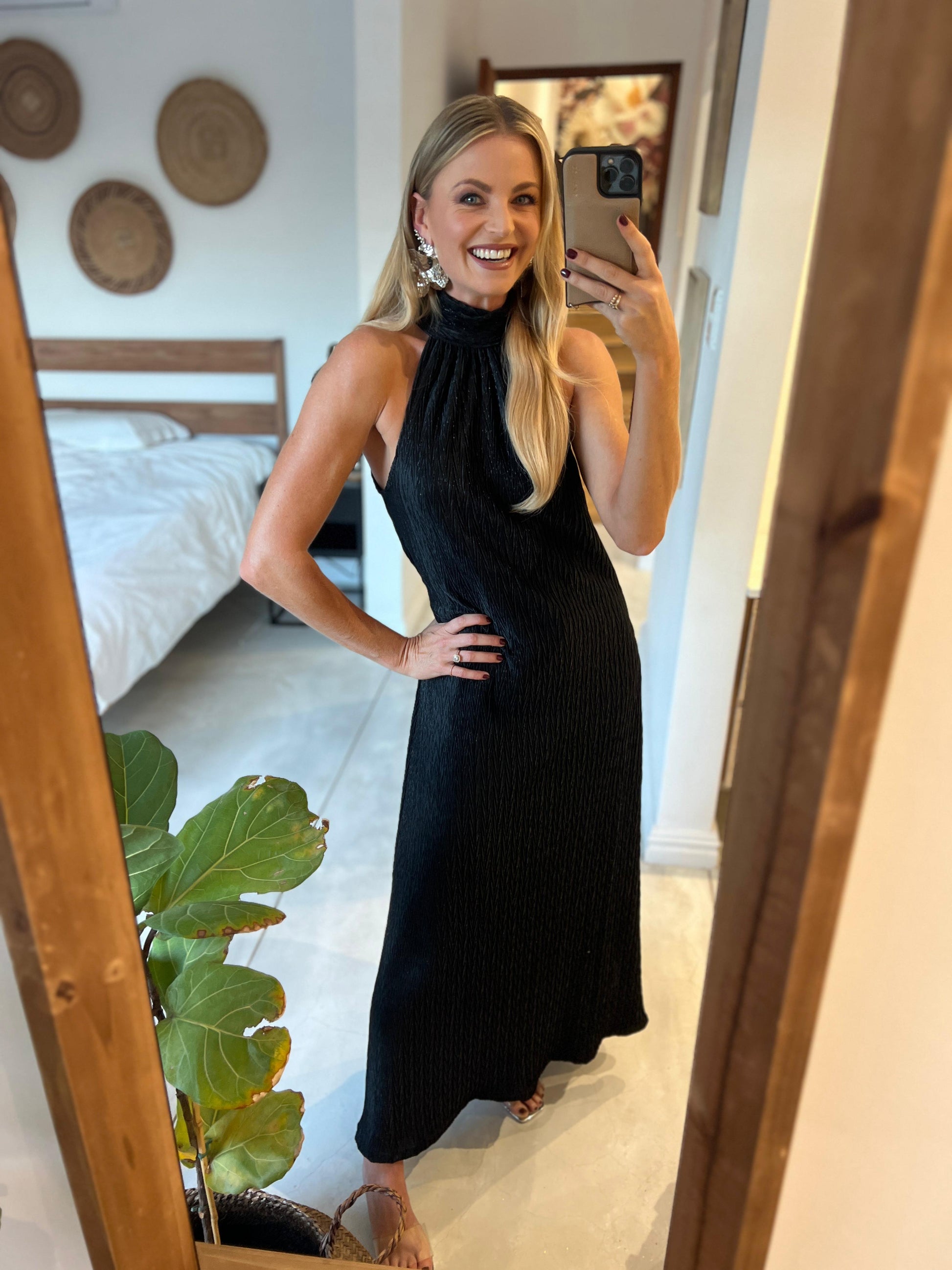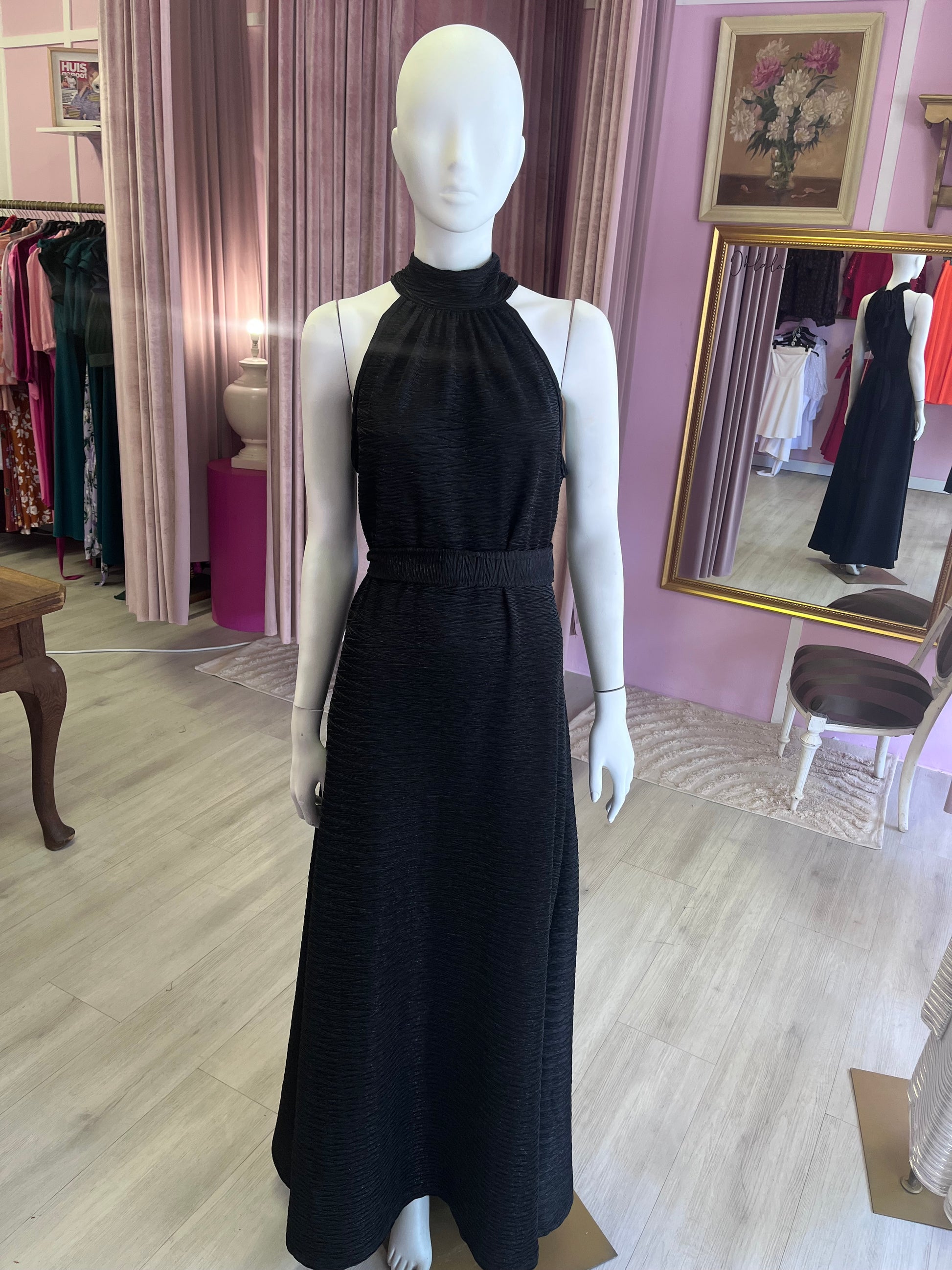 The Heike Dress in Black is the epitome of understated elegance. With its halter-inspired high neckline and flowing silhouette, it offers a refined yet modern look that works for any occasion.