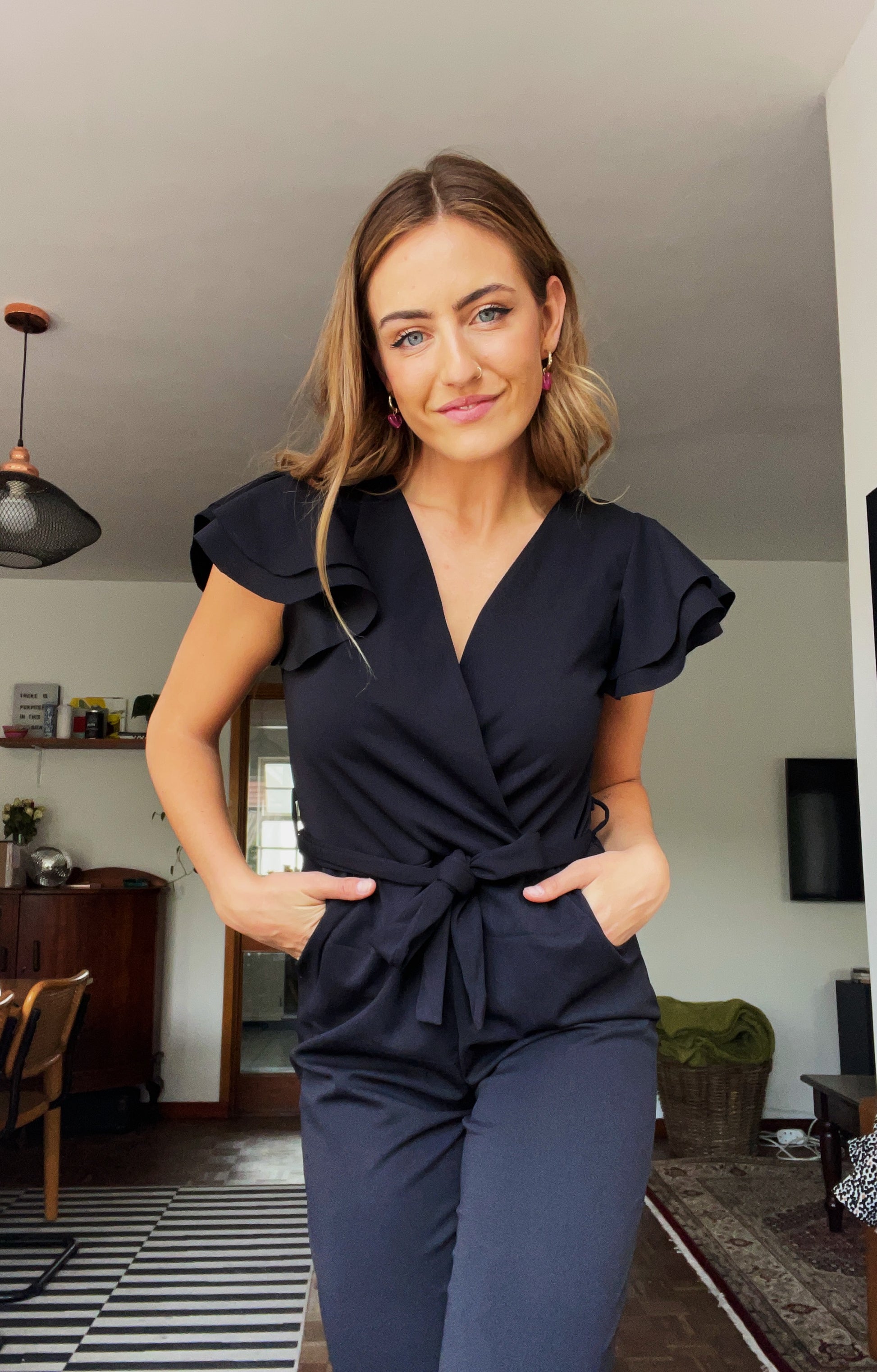 Featuring a wrap-style bodice with ruffle sleeves and a flattering waist tie, this jumpsuit combines sophistication with a playful edge. The tailored fit creates a sleek silhouette, while the full-length design adds timeless charm.
