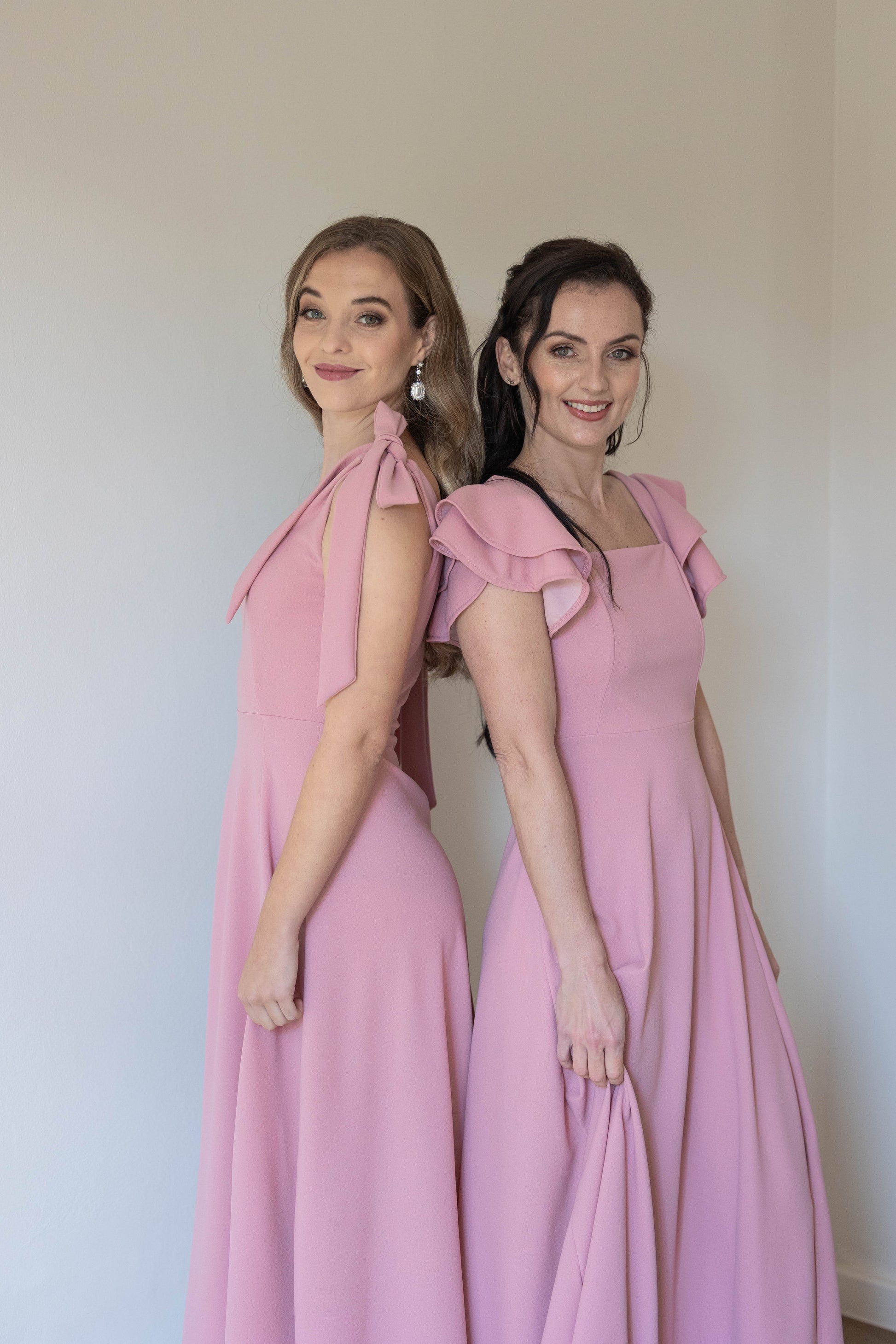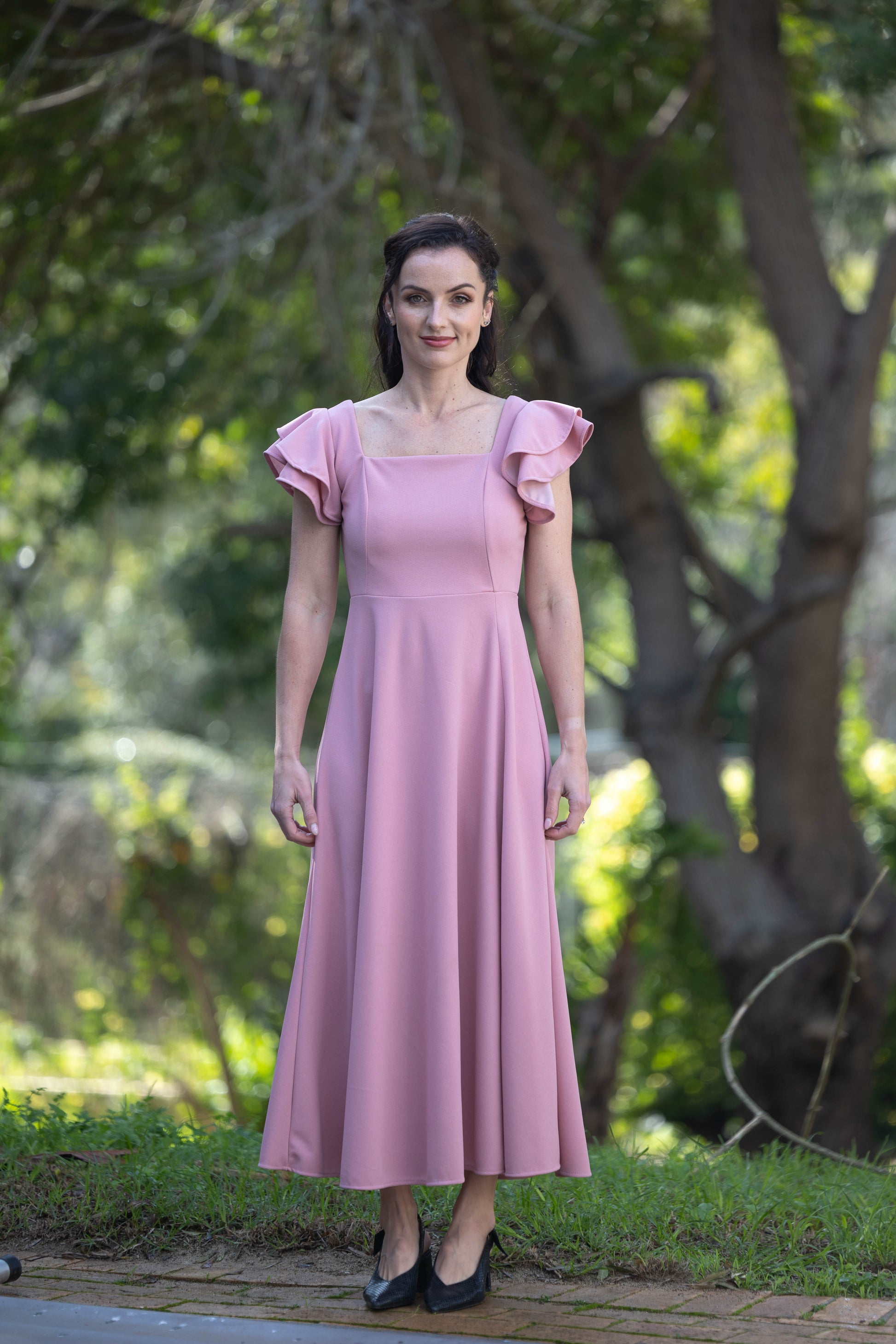 The midi-length silhouette features delicate ruffle sleeves and a gently fitted bodice that complements every figure. Available in multiple shades, it’s a perfect option for bridesmaids, weddings, or special events.