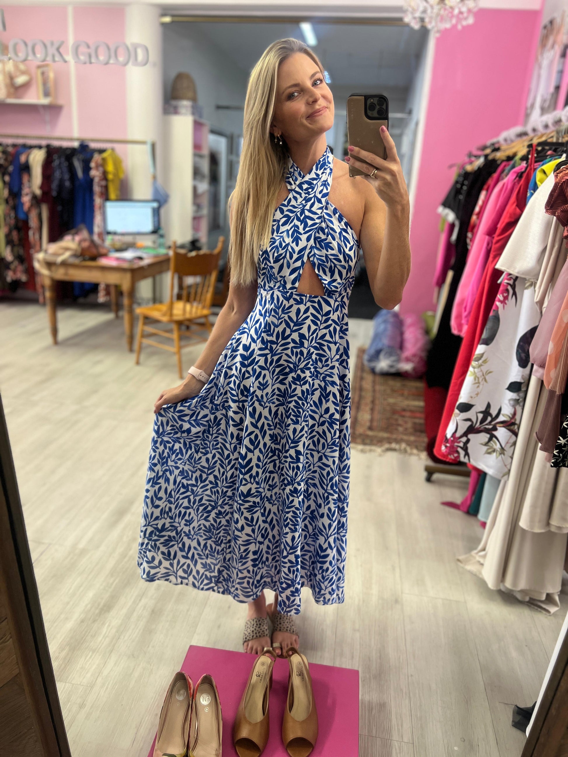 This halter-style dress features a flattering neckline with a chic front cutout and a flowy midi skirt. Its silhouette combines elegance with a playful touch.