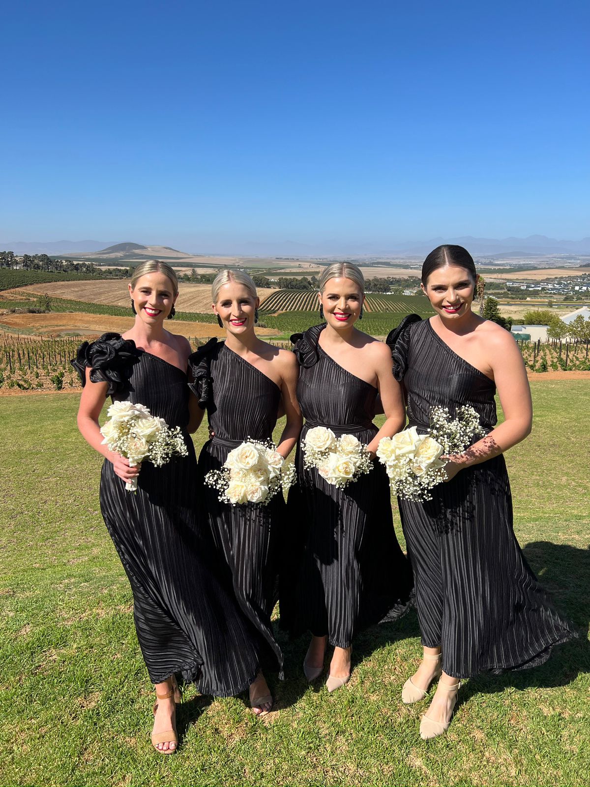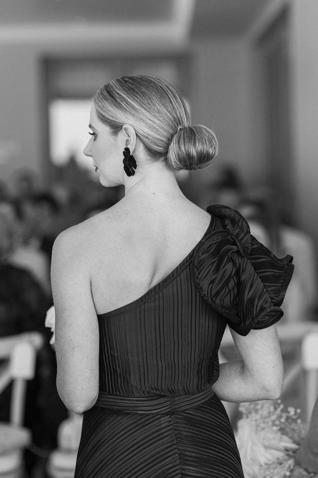 In classic black, this bridesmaid dress radiates chic minimalism while complementing any wedding palette. Pair with delicate jewelry for understated beauty, or go bold with statement accessories.