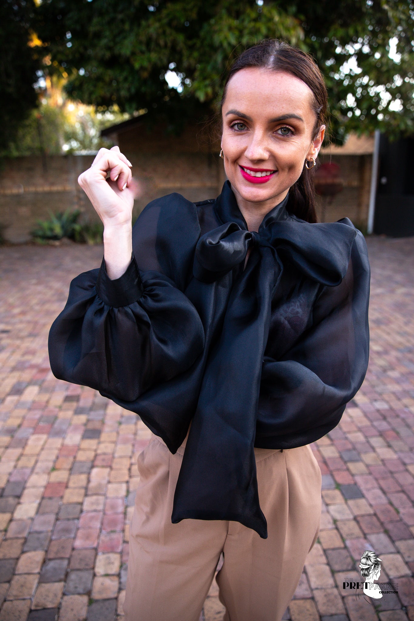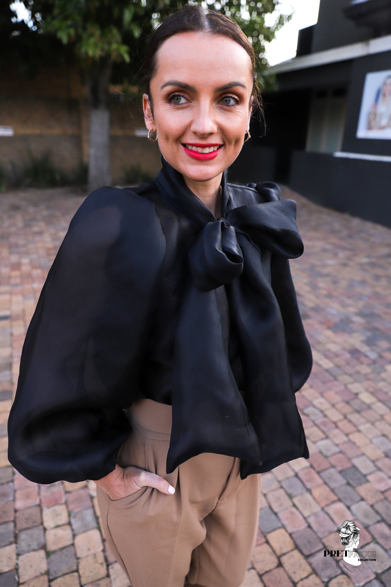 Featuring voluminous puff sleeves and a striking oversized bow, this blouse captures a sense of modern romance. The semi-sheer organza finish adds depth and texture, making it perfect for layering over camisoles or bralettes.