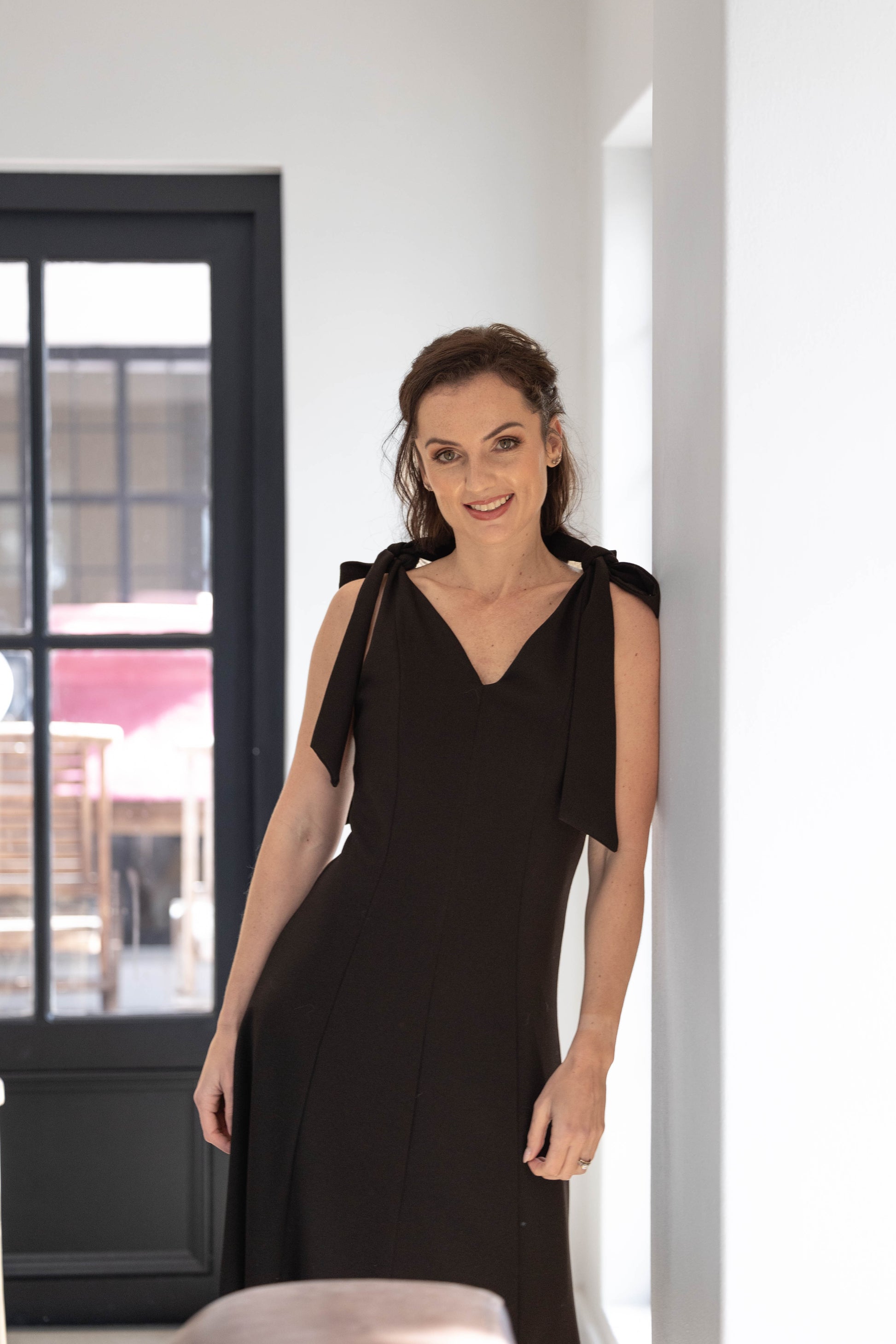 The Fiona Dress is a timeless piece designed to flatter with its sleek silhouette and bow-tie shoulder detail. Perfect for both day and evening wear, it balances modern minimalism with a feminine touch.